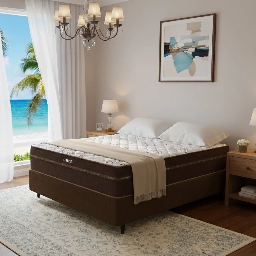 Colchão Casal Lisboa D28 + Base Box Simples Corino Marrom – ECOTEC + ALTO NÍVEL CAMAS E COLCHÕES