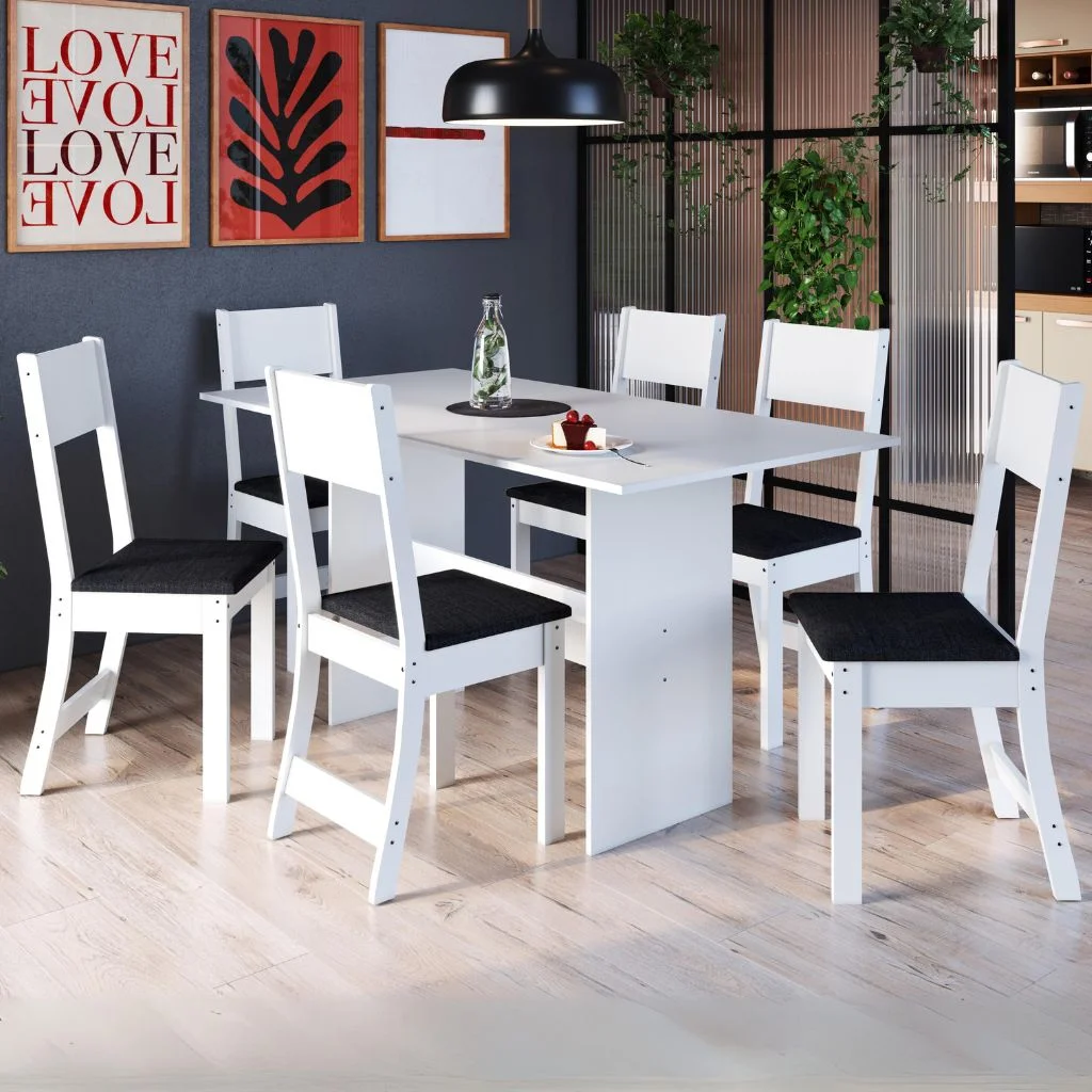 Mesa 6 Cadeiras Karla Branco/Linho Preto – INDÉKES
