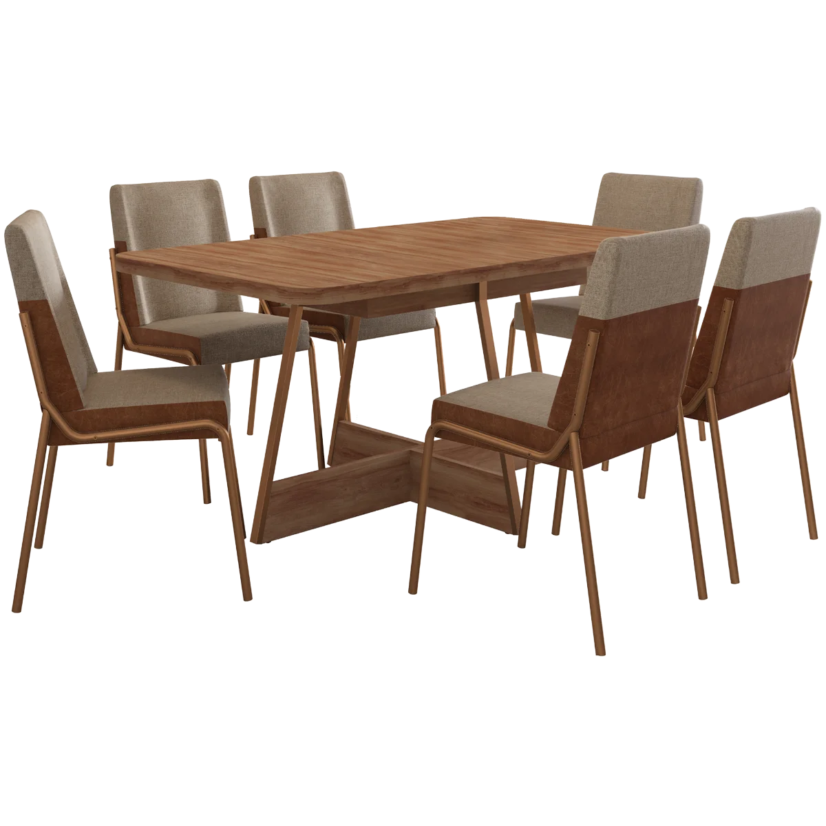 Mesa Átria 1592 Retangular 160 Rosê Cobre/Nogal Freijó com Cadeiras Hug 1749 Rosê Cobre/Linho Areia/Corino Caramelo – CARRARO MÓVEIS